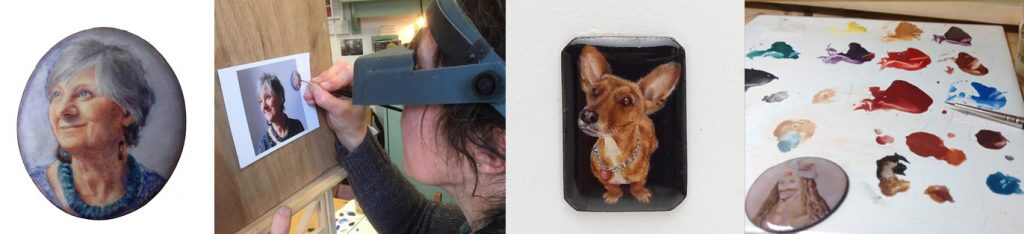 To create an enamel miniature, a small metal plaque is formed, usually out of 18ct yellow gold, silver or copper depending on budget. This base is then covered with several layers of enamel either white or opalescent, each of which are fired in a kiln, to create a smooth surface to paint on to. Finally the painting is started. The powered oxides are mixed with oil to create the ‘paint’ and they are applied in thin washes over about 5-10 layers to develop the image, each layer fired as you go.